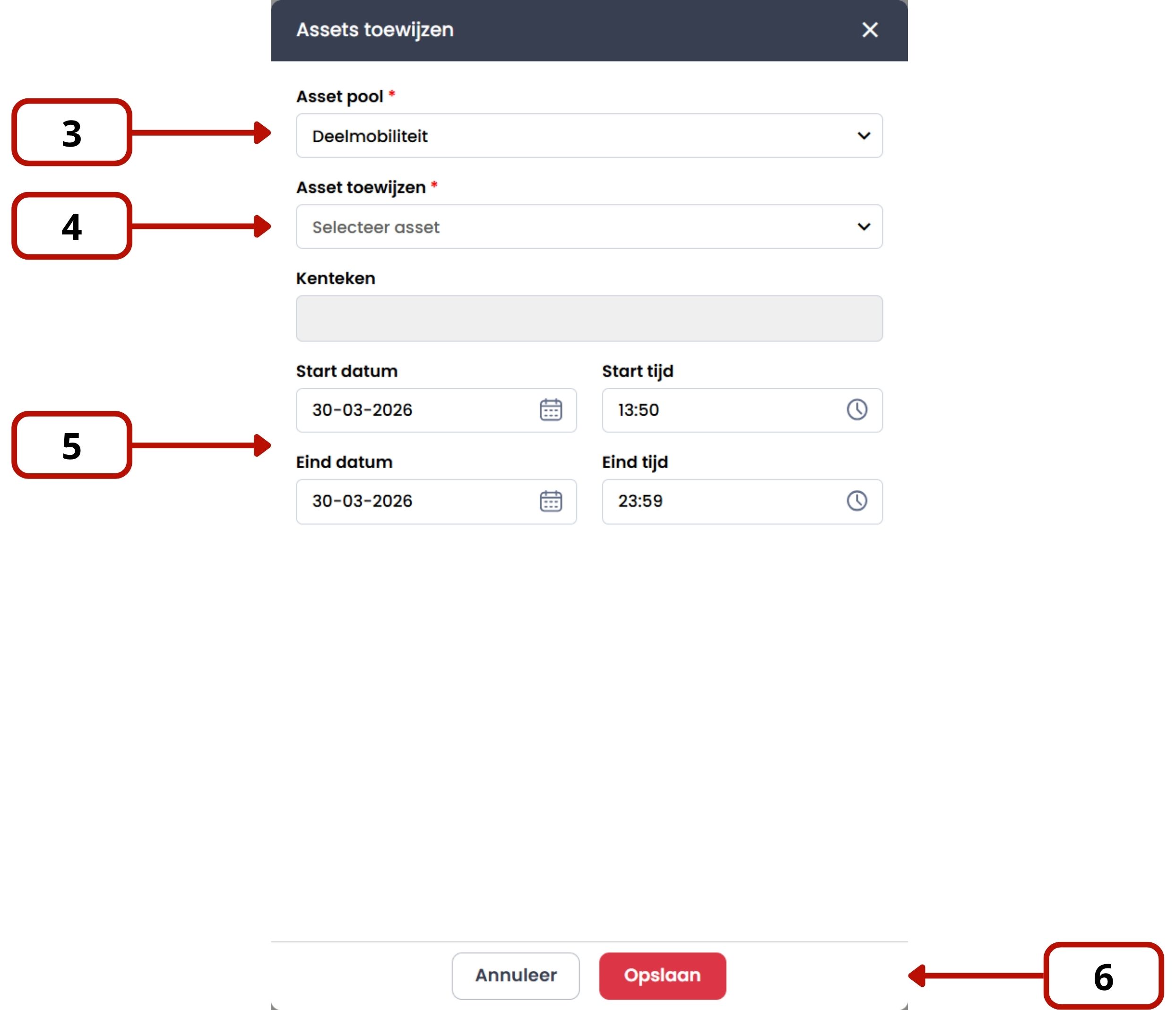 - Kies de asset (voertuig).