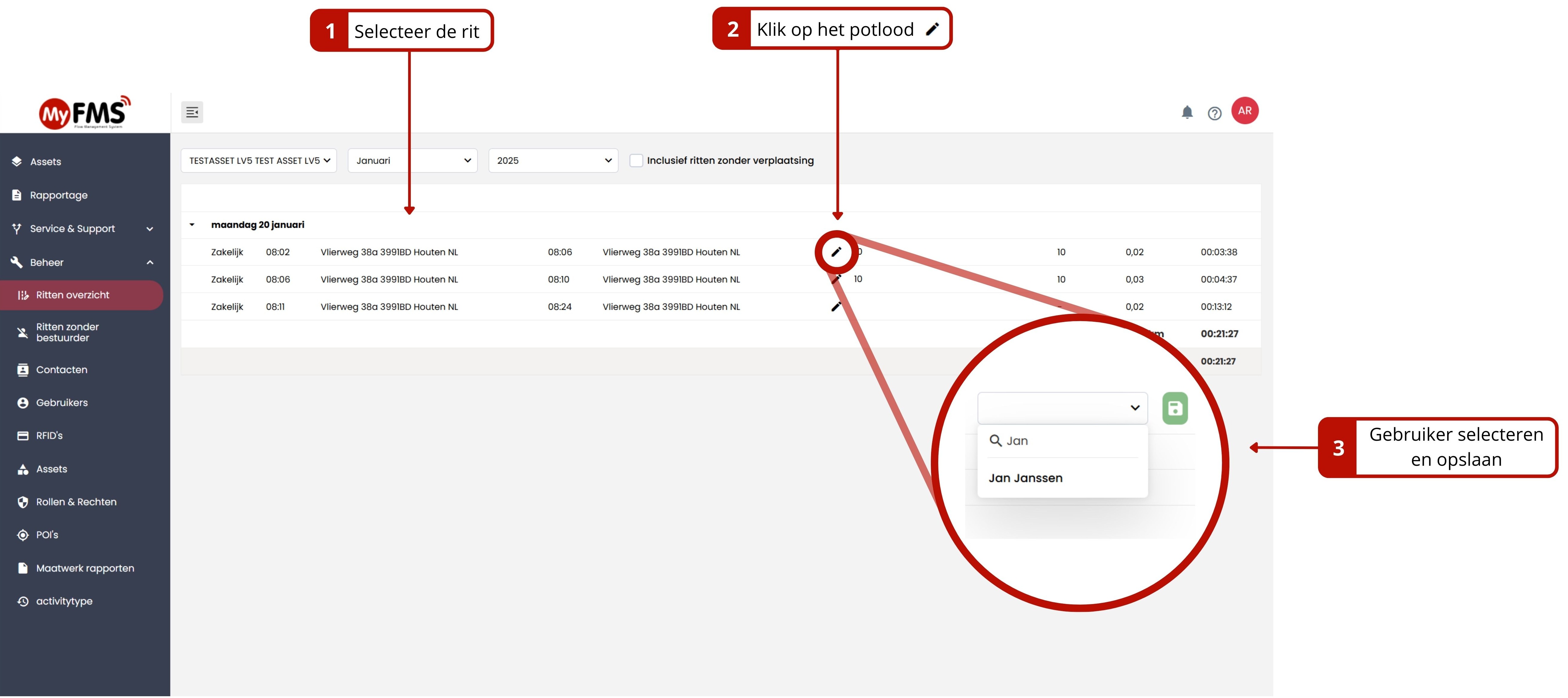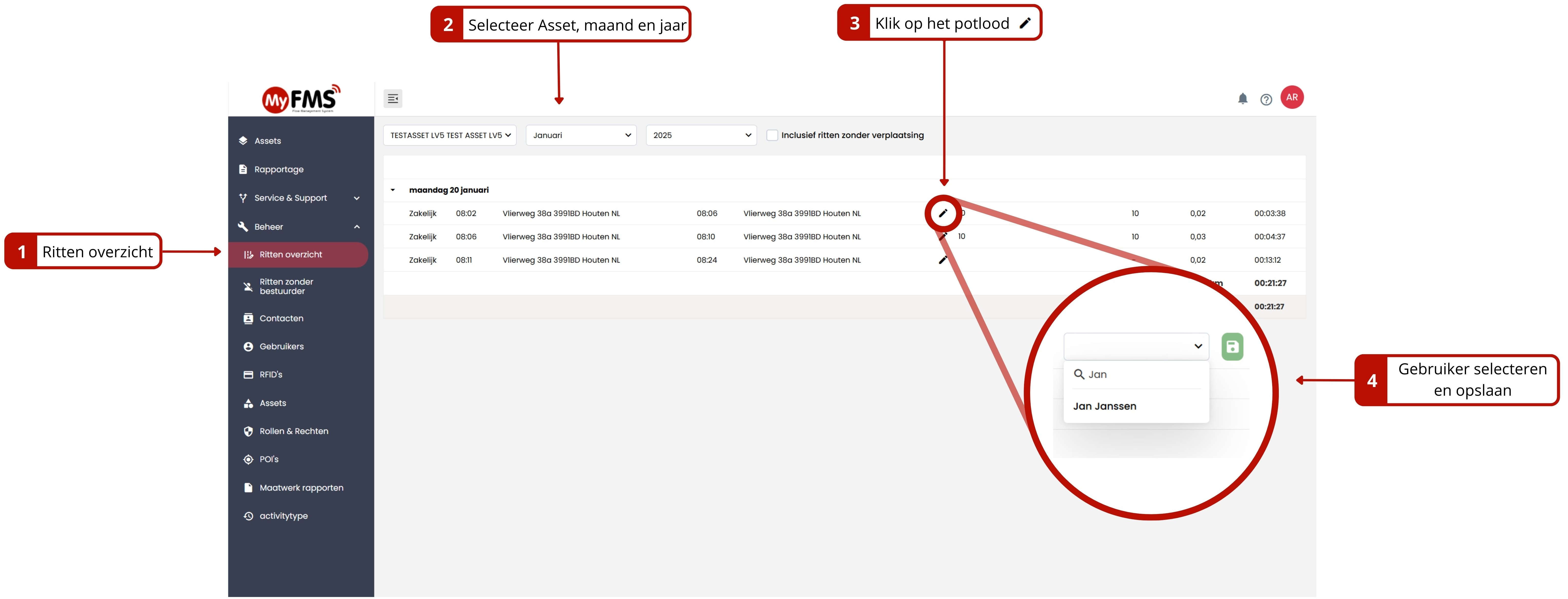 In MyFMS kan achteraf een rit zonder geregistreerde bestuurder alsnog aan een bestuurder gekoppeld worden.