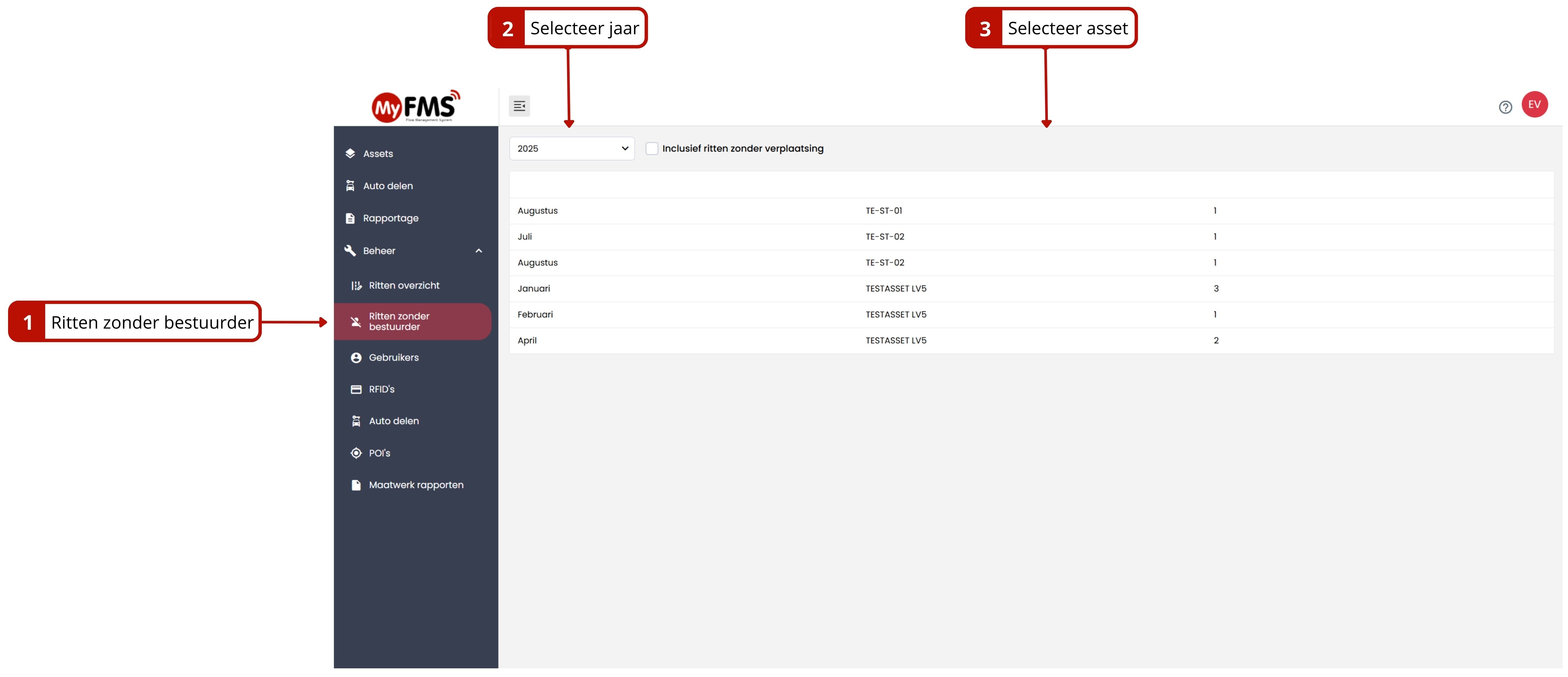 - Selecteer de asset, maand en jaartal en eventueel de optie "Inclusief ritten zonder verplaatsing"